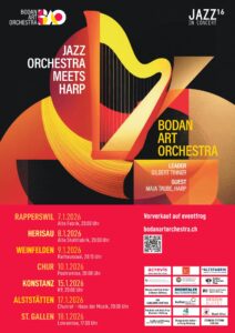 Das Bodan Art Orchestra hat sich als offenes Klangkollektiv einen Namen gemacht. Musiker aus der Schweiz, Deutschland und Österreich bringen ihre individuellen Handschriften ein – als Interpreten und Komponisten. Für das aktuelle Projekt entstehen neue Werke, die im Spannungsfeld zwischen Komposition und Improvisation, Struktur und Freiheit gestaltet werden. Die Harfe, sonst oft in der Nebenrolle, übernimmt hier eine zentrale musikalische Funktion: als klangliche Impulsgeberin, als fragile, aber zugleich durchsetzungsstarke Solostimme.