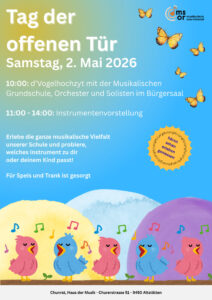 Bereits um 10.00 Uhr erwartet euch im Bürgersaal ein besonderes Highlight: die Aufführung der „Vogelhochzyt“. Schülerinnen und Schüler singen gemeinsam, begleitet von Lehrpersonen im Orchester. Auch die Klassen der Musikalischen Grundschule wirken mit und machen dieses Konzert zu einem lebendigen Gemeinschaftserlebnis.